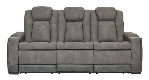 Signature Design by Ashley®Sleek, ultra-modern power reclining sofa. Two-tone Durapella upholstery is more durable and water-repellent than regular leather. Includes drop-dow...