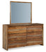 Details | B790B5: Includes panel headboard, panel footboard, rails and slats , Made with sheesham wood, veneer and MDF substrate, Clear natural wood-tone finish , Headboard with beveled frame, Foundation/box spring required, sold separately , Mattress available, sold separately, Assembly required, B790B1: Includes dresser and mirror, Made with sheesham wood, veneer and MDF substrate, Clear natural wood-tone finish , Front frame with thick beveled edge, 6 smooth-gliding drawers with fully finished interior, dovetail construction and heavy duty ball-bearing side glides, Mirror attaches to back of dresser, | |