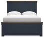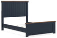 Details | B414B3: Includes panel headboard, footboard, rails and slats, Made with hardwood solids, mindi wood veneer and MDF substrates, Two-tone finish features a dark slate blue with a light brown wood-tone top, Foundation/box spring required, sold separately, Mattress available, sold separately, Assembly required, B414B1: Includes dresser and mirror, Made with hardwood solids, mindi wood veneer and MDF substrates, Two-tone finish features a dark slate blue with light brown wood-tone top, Nickel-tone metal knobs, 6 drawers with fully finished interior, dovetail construction and heavy duty ball-bearing side glides, Mirror attaches to back of dresser, | |