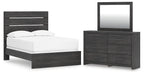 Details | PCB2108B12: Includes panel headboard/footboard and rails, Made with engineered wood (MDF/particleboard/plywood) and decorative laminate for the right balance of affordability and durability , Charcoal finish over replicated oak grain with authentic touch, Decorative laminate replicates natural or man-made material surfaces with consistent color, pattern and texture, Foundation/box spring required, sold separately , Mattress available, sold separately, Minor assembly required, PCB2108B1: Includes dresser and mirror, Made with engineered wood (MDF/particleboard/plywood) and decorative laminate for the right balance of affordability and durability , Charcoal finish over replicated oak grain with authentic touch, Decorative laminate replicates natural or man-made material surfaces with consistent color, pattern and texture, Large-scale dark colored handles, 6 smooth-gliding drawers, Drawer interiors are lined with a faux linen laminate for a clean, finished look , Mirror attaches to back of dresser; can also be mounted on wall horizontally or vertically, Safety is a top priority, clothing storage units are designed to meet the most current standard for stability, ASTM F 2057 (ASTM International), Drawers extend out to accommodate maximum access to drawer interior while maintaining safety, Minor assembly required, | |
