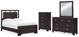 Details | B441B4: Includes panel headboard, footboard, rails and slats, Made with hardwood solids, engineered wood veneer and MDF substrates, Dark brown finish, Floating panel headboard, Picture frame footboard, Foundation/box spring required, sold separately , Mattress available, sold separately, Assembly required, B441B1: Includes dresser and mirror, Made with hardwood solids, engineered wood veneer and MDF substrates, Dark brown finish, Metal bar pulls with bright nickel-tone finish, 7 smooth-gliding drawers with dovetail construction and metal center guides, Drawer interiors are lined with a wood grain laminate for a clean, finished look, Top moulding on dresser, Mirror attaches to back of dresser, B441-46: Made with hardwood solids, engineered wood veneer and MDF substrates, Dark brown finish, Metal bar pulls with bright nickel-tone finish, 5 smooth-gliding drawers with dovetail construction and metal center guides, Drawer interiors are lined with a wood grain laminate for a clean, finished look, Top moulding, | |