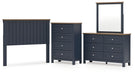 Details | B414-87: Made with hardwood solids, mindi wood veneer and MDF substrates, Two-tone finish features a dark slate blue with a light brown wood-tone top, ¼" bolts (not included) are needed to attach headboard to your existing bed frame, Assembly required, B414B1: Includes dresser and mirror, Made with hardwood solids, mindi wood veneer and MDF substrates, Two-tone finish features a dark slate blue with light brown wood-tone top, Nickel-tone metal knobs, 6 drawers with fully finished interior, dovetail construction and heavy duty ball-bearing side glides, Mirror attaches to back of dresser, B414-45: Made with hardwood solids, mindi wood veneer and MDF substrates, Two-tone finish features a dark slate blue with a light brown wood-tone top, Nickel-tone metal knobs, 4 drawers with fully finished interior, dovetail construction and heavy duty ball-bearing side glides, | |