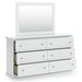 Details | B139B47: Includes panel headboard/footboard and rails, Made with engineered wood (MDF/particleboard/plywood) and decorative laminate for the right balance of affordability and durability, Replicated solid white paint, Decorative laminate replicates natural or man-made material surfaces with consistent color, pattern and texture, Foundation/box spring required, sold separately, Mattress available, sold separately, Assembly required, B139B40: Includes dresser and mirror, Made of engineered wood (MDF/particleboard), Knobs with pewter-tone finish, Scalloped moulding, 6 smooth-operating drawers, Includes tipover restraint device, Mirror attaches to back of dresser; can also be mounted on wall horizontally or vertically, Safety is a top priority, clothing storage units are designed to meet the most current standard for stability, ASTM F 2057 (ASTM International), Drawers extend out to accommodate maximum access to drawer interior while maintaining safety, B139-46: Made of engineered wood (MDF/particleboard), Pewter-tone knobs, Scalloped moulding, 5 smooth-operating drawers, Small Space Solution, Includes tipover restraint device, Safety is a top priority, clothing storage units are designed to meet the most current standard for stability, ASTM F 2057 (ASTM International), Drawers extend out to accommodate maximum access to drawer interior while maintaining safety, | |