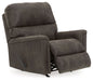 If you love the cool look of leather but long for the warm feel of fabric, you can take comfort in this rocker recliner. Wrapped in a fabulous faux leather with a weathered hue and hint of pebbly texture to resemble the real deal, this decidedly modern recliner proves less is more. Elements include angled side profiling and track armrests wrapped with a layer of pillowy softness for that little something extra. Prominent jumbo stitching and clean-lined divided back styling lend fashion-forward flair.