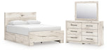 Details | B2310B8: Includes panel headboard, panel footboard, 2 under bed storage units and roll slats , Made with engineered wood (MDF/particleboard/plywood) and decorative laminate for the right balance of affordability and durability, Rustic white finish over replicated reclaimed oak grain with authentic touch, Decorative laminate replicates natural or man-made material surfaces with consistent color, pattern and texture, 4 smooth-gliding storage drawers, Drawer interiors are lined with a faux linen laminate for a clean, finished look, Bed does not require additional foundation/box spring; accommodates most zero clearance adjustable bases with the addition of a bunkie board , Mattress available, sold separately, Minor assembly required, B2310B1: Made with engineered wood (MDF/particleboard/plywood) and decorative laminate for the right balance of affordability and durability, Rustic white finish over replicated reclaimed oak grain with authentic touch, Decorative laminate replicates natural or man-made material surfaces with consistent color, pattern and texture, Handles with dark pewter-tone finish, 6 smooth-gliding drawers, Drawer interiors are lined with a faux linen laminate for a clean, finished look, Framed front and pilasters, Safety is a top priority, clothing storage units are designed to meet the most current standard for stability, ASTM F 2057 (ASTM International), Drawers extend out to accommodate maximum access to drawer interior while maintaining safety, Mirror attaches to back of dresser; can also be mounted on wall horizontally or vertically , Minor assembly required, | |