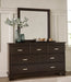 Details B441B6: Includes panel headboard, footboard, rails and slats, Made with hardwood solids, engineered wood veneer and MDF substrates, Dark brown finish, Floating panel headboard, Picture frame footboard, Foundation/box spring required, sold separately , Mattress available, sold separately, Assembly required, B441B1: Includes dresser and mirror, Made with hardwood solids, engineered wood veneer and MDF substrates, Dark brown finish, Metal bar pulls with bright nickel-tone finish, 7 smooth-gliding drawers with dovetail construction and metal center guides, Drawer interiors are lined with a wood grain laminate for a clean, finished look, Top moulding on dresser, Mirror attaches to back of dresser, B441-92: Made with hardwood solids, engineered wood veneer and MDF substrates, Dark brown finish, Metal bar pulls with bright nickel-tone finish, 2 smooth-gliding drawers with dovetail construction and metal center guides, Drawer interiors are lined with a wood grain laminate for a clean, finished look, Top moulding,