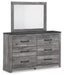 Details | B1290B2: Includes queen panel headboard/footboard and rails, Made with engineered wood (MDF/particleboard/plywood) and decorative laminate for the right balance of affordability and durability, Smoky gray finish over replicated oak grain with authentic touch, Decorative laminate replicates natural or man-made material surfaces with consistent color, pattern and texture, Foundation/box spring required, sold separately, Mattress available, sold separately, Assembly required, Bed is compatible with an adjustable base, B1290B1: Includes dresser and mirror, Made with engineered wood (MDF/particleboard/plywood) and decorative laminate for the right balance of affordability and durability, Two-tone look: smoky gray replicated oak grain accented with rustic charcoal finish; replicated oak grain with authentic touch, Charcoal finish over replicated oak grain with authentic touch, Decorative laminate replicates natural or man-made material surfaces with consistent color, pattern and texture, Large-scaled handles in a dark hue, 6 smooth-gliding drawers with dovetail construction, Drawer interiors are lined with a faux linen laminate for a clean, finished look, Framed front and pilasters, Mirror attaches to back of dresser; can also be mounted on wall horizontally or vertically, Safety is a top priority, clothing storage units are designed to meet the most current standard for stability, ASTM F 2057 (ASTM International), Drawers extend out to accommodate maximum access to drawer interior while maintaining safety, Assembly required, B1290-92: Expertly made with engineered wood (MDF/particleboard) for the right balance of affordability and durability, Decorative laminate replicates natural or man-made material surfaces with consistent color, pattern and texture, Two-tone look: smoky gray replicated oak grain accented with rustic charcoal finish; replicated oak grain with authentic touch, Large-scaled handles in a dark hue, 2 smooth-gliding drawers with dovetail construction, Drawer interiors are lined with a faux linen laminate for a clean, finished look, Framed front and pilasters, Assembly required, | |