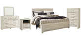 Details | B331B2: Includes headboard, footboard and rails, Made of engineered wood (MDF/particleboard) and decorative laminate, Wispy white finish over replicated oak grain with authentic touch, Foundation/box spring required, sold separately, Mattress available, sold separately, Assembly required, Bed is compatible with an adjustable base, B331B1: Includes dresser and mirror, Made of engineered wood (MDF/particleboard) and decorative laminate, Wispy white finish over replicated oak grain with authentic touch, Brushed nickel-tone hardware with black edging, 7 smooth-gliding drawers (lined with faux linen laminate), Mirror attaches to back of dresser, Safety is a top priority, clothing storage units are designed to meet the most current standard for stability, ASTM F 2057 (ASTM International), Drawers extend out to accommodate maximum access to drawer interior while maintaining safety, Assembly required, B331-46: Made of engineered wood (MDF/particleboard) and decorative laminate, Wispy white finish over replicated oak grain with authentic touch, Brushed nickel-tone hardware with black edging, 5 smooth-gliding drawers (lined with faux linen laminate), Safety is a top priority, clothing storage units are designed to meet the most current standard for stability, ASTM F 2057 (ASTM International), Drawers extend out to accommodate maximum access to drawer interior while maintaining safety, Assembly required, B331-91: Made of engineered wood (MDF/particleboard) and decorative laminate, Wispy white finish over replicated oak grain with authentic touch, 1 storage cubby, 1 smooth-gliding drawer (lined with faux linen laminate), Brushed nickel-tone hardware with black edging, Slim-profile USB charging station, Power cord included; UL Listed, Assembly required, | |