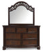 Details | B764B5: Includes poster headboard/footboard panels, rails and headboard posts, Made with hardwood solids, cherry veneer with MDF substrates, decorative cast resin and furniture grade plastic components , Cherry brown finish, Headboard with metallic accent filigree, Foundation/box spring required, sold separately, Mattress available, sold separately, Assembly required, B764B1: Includes dresser and mirror, Made with hardwood solids, cherry veneer with MDF substrates, decorative cast resin and furniture grade plastic components , Cherry brown finish, Decorative metal drawer pulls with dark bronze-tone finish, 7 drawers with fully finished interior, dovetail construction and ball-bearing side glides, Mirror attaches to back of dresser, B764-46: Made with hardwood solids, cherry veneer with MDF substrates, decorative cast resin and furniture grade plastic components, Cherry brown finish, Decorative metal drawer pulls with dark bronze-tone finish, 5 drawers with fully finished interior, dovetail construction and ball-bearing side glides, B764-93: Made with hardwood solids, cherry veneer with MDF substrates, decorative cast resin and furniture grade plastic components, Cherry brown finish, Decorative metal drawer pulls with dark bronze-tone finish, 2 drawers with fully finished interior, dovetail construction and ball-bearing side glides, Pull-out tray behind bottom drawer, | |