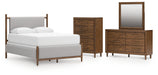 Details | B615B2: Includes upholstered panel headboard and footboard , Solid wood frame, Due to the use of natural wood materials, some variations may occur , Frame with medium brown wood tone finish, Polyester upholstery, Tapered legs, Foundation/box spring required, sold separately , Mattress available, sold separately, Assembly required, B615B1: Includes dresser and mirror, Made with hardwood solids, mango wood veneer and MDF substrates, Medium brown wood-tone finish, 6 drawers with fully finished interior, dovetail construction and heavy duty ball-bearing side glides, Round tapered legs, Mirror attaches to back of dresser, B615-46: Made with hardwood solids, mango wood veneer and MDF substrates, Medium brown wood-tone finish, 5 drawers with fully finished interior, dovetail construction and heavy duty ball-bearing side glides, Round tapered legs, | |