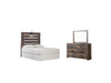 Details | B211-53: Hardware not included, Made of engineered wood (MDF/particleboard) and decorative laminate, Brown rustic finish with burnt orange and teal accents in a replicated wood grain with authentic touch, Decorative sconce light, LED with 3 AA batteries, 2 slim-profile USB charging stations, Power cord included; UL Listed, ¼" bolts are needed to attach headboard to existing bed frame, Bolt length depends on thickness of your bed frame, Assembly required, B211B1: Made of engineered wood (MDF/particleboard) and decorative laminate, Brown rustic finish with burnt orange and teal accents in a replicated wood grain with authentic touch, 6 smooth-gliding drawers, Drawers lined with faux linen laminate, Dark-tone industrial hardware, Mirror attaches to back of dresser, Assembly required, Includes tipover restraint device, | |