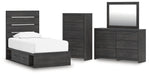 Details | PCB2108B17: Includes panel headboard/footboard, rails with side storage and roll slats, Made with engineered wood (MDF/particleboard/plywood) and decorative laminate for the right balance of affordability and durability , Charcoal finish over replicated oak grain with authentic touch, Decorative laminate replicates natural or man-made material surfaces with consistent color, pattern and texture, 2 smooth-gliding drawers, 2 storage cubbies, Bed does not require additional foundation/box spring; accommodates most zero clearance adjustable bases with the addition of a bunkie board, Mattress available, sold separately, Minor assembly required, PCB2108B1: Includes dresser and mirror, Made with engineered wood (MDF/particleboard/plywood) and decorative laminate for the right balance of affordability and durability , Charcoal finish over replicated oak grain with authentic touch, Decorative laminate replicates natural or man-made material surfaces with consistent color, pattern and texture, Large-scale dark colored handles, 6 smooth-gliding drawers, Drawer interiors are lined with a faux linen laminate for a clean, finished look , Mirror attaches to back of dresser; can also be mounted on wall horizontally or vertically, Safety is a top priority, clothing storage units are designed to meet the most current standard for stability, ASTM F 2057 (ASTM International), Drawers extend out to accommodate maximum access to drawer interior while maintaining safety, Minor assembly required, PCB2108-46: Made with engineered wood (MDF/particleboard/plywood) and decorative laminate for the right balance of affordability and durability, Charcoal finish over replicated oak grain with authentic touch, Decorative laminate replicates natural or man-made material surfaces with consistent color, pattern and texture, Large-scale dark colored handles, 5 smooth-gliding drawers, Drawer interiors are lined with a faux linen laminate for a clean, finished look, Safety is a top priority, clothing storage units are designed to meet the most current standard for stability, ASTM F 2057 (ASTM International), Drawers extend out to accommodate maximum access to drawer interior while maintaining safety, Minor assembly required, | |