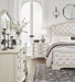 Add a touch of romance to your bedroom with this bedroom package. Its antiqued white painted finish is the picture of easy elegance. From serpentine-shaped silhouettes to head-to-toe button tufting, the set's decadent details further indulge your love of luxury.
