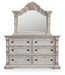 Details PCB948B4: Includes upholstered panel headboard, footboard, rails and slats, Made with hardwood solids, oak and ash swirl veneers, MDF substrates and cast resin components, Side rails feature laminated solid hardwood slat support rails (or LVL) with glued and screwed blocking for added strength, Antiqued white finish, Polyester upholstery, Foundation/box spring required, sold separately, Mattress available, sold separately , Assembly required, PCB948B1: Includes dresser and mirror, Dresser made with hardwood solids, oak and ash swirl veneers, MDF substrates and cast resin components, Mirror made with solid wood, Antiqued white finish, Hardware with antiqued bronze-tone finish, 6 smooth-gliding drawers with fully finished interiors, English dovetail construction and heavy-duty ball-bearing side glides (top drawers felt lined), Mirror attaches to back of dresser, PCB948-93: Made with hardwood solids, oak and ash swirl veneers, MDF substrates and cast resin components, Antiqued white finish, Hardware with antiqued bronze-tone finish, 2 smooth-gliding drawers with fully finished interiors, English dovetail construction and heavy-duty ball-bearing side glides (top drawer felt lined), Pull-out tray behind bottom drawer, 110V power supply with USB-A and USB-C charging ports, Power cord included; UL Listed,