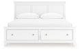 Details | Includes panel headboard, storage footboard, rails and roll slats , Made with hardwood solids and MDF substrate, Side rails feature laminated solid hardwood slat support rails (or LVL) with glued and screwed blocking for added strength , White painted finish, Round metal drawer knobs with satin nickel-tone finish, Tapered feet, 2 smooth-gliding drawers in footboard , Bed does not require additional foundation/box spring; accommodates most zero clearance adjustable bases with the addition of a bunkie board , Mattress available, sold separately, Assembly required | |