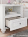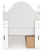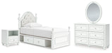 Details PCB1819B9: Includes upholstered panel headboard, panel footboard, roll slats and side storage with rails, Made with engineered wood (MDF/particleboard/plywood) and decorative laminate for the right balance of affordability and durability , Matte white finish, Decorative laminate replicates natural or man-made material surfaces with consistent color, pattern and texture , Polyester upholstery, Crystal drawer knobs; acrylic ball tops, 2 smooth-gliding drawers; drawer interiors are lined with a faux linen laminate for a clean, finished look, Open cubbies accommodate any 10.5" W x 10.5" D x 11" H storage bin (not included), Pink, purple and white LED lighting options; touch button control, Power cord included; UL Listed, Bed does not require additional foundation/box spring; accommodates most zero clearance adjustable bases with the addition of a bunkie board, Mattress available, sold separately, Minor assembly required, PCB1819B2: Includes dresser and mirror, Made with engineered wood (MDF/particleboard/plywood) and decorative laminate for the right balance of affordability and durability , Matte white finish, Decorative laminate replicates natural or man-made material surfaces with consistent color, pattern and texture , Crystal drawer knobs, 6 smooth-gliding drawers, Drawer interiors are lined with a faux linen laminate for a clean, finished look, Safety is a top priority, clothing storage units are designed to meet the most current standards for stability, ATM F 2057 (ASTM International), Drawers extend out to accommodate maximum access to drawer interior while maintaining safety, Mirror can be mounted on wall vertically , Minor assembly required, PCB1819-91: Made with engineered wood (MDF/particleboard/plywood) and decorative laminate for the right balance of affordability and durability, Matte white finish, Decorative laminate replicates natural or man-made material surfaces with consistent color, pattern and texture, Crystal drawer knob, 1 smooth-operating drawer, Drawer interior is lined with a faux linen laminate for a clean, finished look, Open shelf, USB-A and USB-C charging ports, Pink, purple and white LED lighting options; touch button control, Power cord included; UL Listed, Minor assembly required,