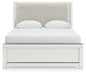 Details | Includes upholstered panel headboard, panel footboard and panel rails , Made with engineered wood (MDF/particleboard/plywood) and decorative laminate for the right balance of affordability and durability , Matte white finish with subtle replicated wood grain , Decorative laminate replicates natural or man-made material surfaces with consistent color, pattern and texture , Polyester upholstery , Chrome-tone and glitter accents, Foundation/box spring required, sold separately, Mattress available, sold separately, Minor assembly required | |