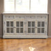- Stone Acid Wash Glazed Sideboard - This country sideboard is constructed from 100% solid mango wood which is meticulously hot dipped using a laborious caustic wash technique. This lengthy multi stage finishing process gives a beautiful weathered and aged acid washed finish. It comes with 4 glazed doors with shelves inside and 4 drawers; to place things such as special ornaments, pictures etc. The door cabinets and drawers come with shiny, round knob handles.