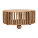 - Slatted Round Oak-ish Coffee Table - A captivating fusion of modern aesthetics and natural craftsmanship, this round coffee table is expertly handcrafted from 100% Solid Mango Wood in a warm Oak-ish finish. Its slatted base design creates a striking visual appeal while allowing for an airy, open feel. Resting on bun wooden feet, this table exudes effortless elegance and stability, making it an ideal centerpiece for living rooms. Perfect for styling with decor or everyday essentials, its sustainable craftsmanship and timeless design bring warmth and sophistication to any space.