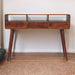 - Triple Curved Chestnut Console Table - This simple, elegant console table has beautifully curved edges to fit perfectly in any living space, this 100% solid mango wood unit has been built with sustainably sourced timbers and has 3 drawers as well as 3 open slots for plenty of storage space to help you keep your home organized. It has a shiny brass knob on each drawer and has a fine chestnut finish with 4 Nordic style legs.