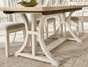 Details | D683-35: Made with hardwood solids, select veneers and MDF substrates, Two-tone finish (antiqued white and light grayish brown wood tone), Double trestle base, Removable center leaf stores conveniently underneath the tabletop, Table extends by pulling both ends and dropping in leaf, Seats up to 8, Assembly required, D683-02: Made with solid wood frame, Antiqued white finish, Polyester upholstery, Next-Gen Nuvella™ is a performance fabric that is soft, easy to clean, stain-resistant and durable, Clean fabric with mild soap and water, let air dry; for stubborn stains, use a solution of 4 oz. bleach to 28 oz. water Foam cushioned seat, Legs with adjustable levelers, Assembly required, | |