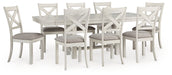 Details | D642-01: Made with solid wood frame, Antiqued white finish with grain texture, Light gray polyester upholstery, Nailhead trim, X-back, Assembly required, D642-45: Made with rubberwood solids, ash veneer and MDF substrates, Antiqued white finish with grain texture, Tabletop with planked effect, Two 12" removable center leaves, Table extends to 86" overall by pulling both ends and dropping in leaves, Seats up to 8, Assembly required, | |