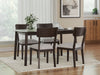 | Details | Includes table and 4 chairs, Table made with hardwood solids, engineered wood veneer and MDF substrates, Chair made with solid wood frame; bent plywood backrest with wood veneer, Rich merlot finish, Polyester upholstery, Foam cushioned seat, Chair includes adjustable levelers, Assembly required | |