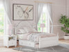 Fit for a princess. This full upholstered panel storage bed’s crisp matte white finish pairs with charming ornate beading details and sumptuous button-tufted upholstery—perfect for your girly girl. Spacious storage drawers neatly tuck away bedroom essentials, while decorative ball tops and multicolored LED lighting in the headboard are the crowning touches to make your little one feel like royalty.