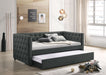 - Design and Material: This daybed features a sophisticated design with button tufting and nail-head trim accents, crafted from a combination of wood, composite wood, upholstered fabric, rubber wood, poplar, and MDF. The elegant color adds a touch of luxury to any room.