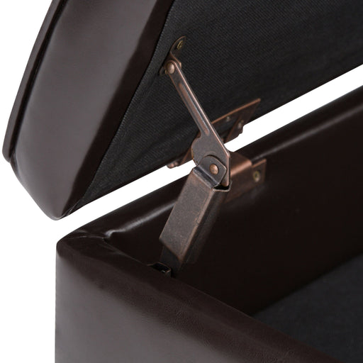 Simpli-HomeHand constructed using solid wood, plywood, foam Upholstered with a durable Tanners Brown Vegan Faux Leather Features lift up lid with child safet...