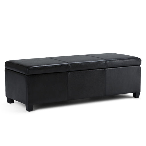 Simpli-HomeUpholstered with Tanners Brown Vegan Faux Leather Constructed using solid wood, plywood, foam Features easy lift up and out top with child safety ...