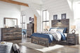 This full-size panel bed with storage, dresser, mirror and chest of drawers is a refined take on barn board beauty. Its complex, replicated wood grain showcases hints of burnt orange and teal tones for a sense of weatherworn authenticity. Double drawers at the foot of the bed also come in mighty handy. The dresser and chest with smooth-gliding drawers lined with faux linen laminate and industrial dark-tone hardware complete this rustic and industrial style bedroom. Mattress and foundation/box spring available, sold separately.