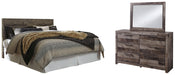 Walk the line between industrial and farmhouse styles with the modern heft of this panel headboard and dresser with mirror. A rustic butcher block finish is tastefully roughhewn with appealing color variations and imperfections. The substantial headboard is hearty and robust while the dresser provides roomy drawers with metal pulls in an antiqued gunmetal finish to complete this eclectic look.