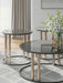 Details | Includes coffee table and 2 end tables, Made with tubular metal legs and frame, Legs with goldtone finish, Frame with matte black finish, Tempered black glass top | |