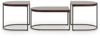 Details | Includes coffee table and 2 end tables, Frame made with tubular metal; top made with wood veneer on MDF substrate, Frame with durable anodized bronze-tone powder coat finish, Top with medium-brown wood-tone finish, Nesting design, Assembly required | |
