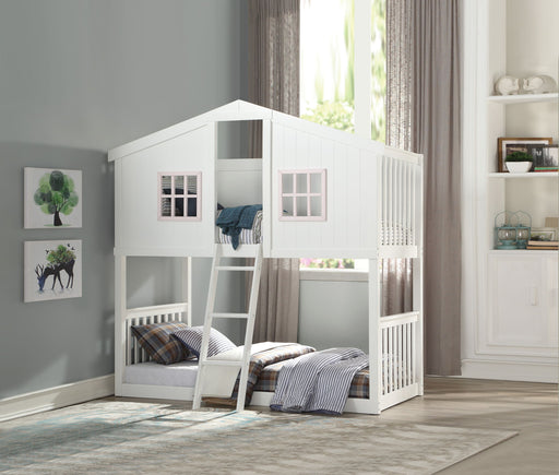 AcmeCharming Cottage Design: This twin-over-twin bunk bed features a delightful cottage style, complete with a doorway, two windows, and an open ...