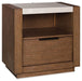 Get the luxe modern look you love at a price you can afford. This nightstand features a structured silhouette on a plinth base that elevates the piece to a modern masterpiece. It has a versatile, two-toned look with its natural marble top and textural surface with a medium brown wood-tone finish. An open shelf and a soft-closing drawer with nickel-tone pull provide just the right amount of storage space. The nightstand marries tech and clean-lined design with its LED night light illuminating the base on three sides. A dual USB charging port within the open shelf area adds extra functionality.