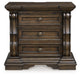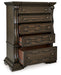 Details B947B10: Includes upholstered poster headboard panel, poster footboard panel, rails, slats, posts and canopy , Made with hardwood solids, oak veneer, MDF substrates and cast resin components, Dark brown finish, Metal canopy, Foam headboard cushion with polyester upholstery, Measure room, including ceiling height, to ensure bed clears fans and light fixtures, Foundation/box spring required, sold separately, Mattress available, sold separately, Assembly required, B947B1: Includes dresser and mirror, Made with hardwood solids, oak and ash swirl veneers, MDF substrates and cast resin components, Dark brown finish, 6 smooth-gliding drawers with dovetail construction (top drawer felt lined), Drawer pulls with antiqued goldtone finish, Mirror attaches to back of dresser, B947-46: Made with hardwood solids, oak and ash swirl veneers, MDF substrates and cast resin components, Dark brown finish, 5 smooth-gliding drawers with dovetail construction (top drawer felt lined), Drawer pulls with antiqued goldtone finish, B947-93: Made with hardwood solids, oak and ash swirl veneers, MDF substrates and cast resin components, Dark brown finish, 2 smooth-gliding drawers with dovetail construction (top drawer felt lined), Pull-out tray behind bottom drawer, Drawer pulls with antiqued goldtone finish, 110V power supply with dual USB charging ports, Power cord included; UL Listed,