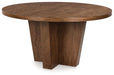 Add exceptional modern farmhouse appeal to your eating and gathering space with this round dining table. A warm brown wood-tone finish enhances the rich natural beauty. With eye-catching architectural geometry and a bold, chunky silhouette, this versatile piece offers a casually delicious design that’s right at home for dining or when friends stop by.