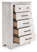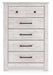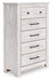 Details Made with engineered wood (MDF/particleboard/plywood) and decorative laminate for the right balance of affordability and durability, Whitewash replicated worn through paint over replicated wood grain with authentic touch, Decorative laminate replicates natural or man-made material surfaces with consistent color, pattern and texture, Hardware with dark bronze-tone finish, 5 smooth-gliding drawers, Safety is a top priority, clothing storage units are designed to meet the most current standard for stability, ASTM F 2057 (ASTM International), Drawers extend out to accommodate maximum access to drawer interior while maintaining safety, Minor assembly required