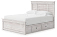 | Details | Includes panel headboard, panel footboard, 2 under bed storage units and roll slats , Made with engineered wood (MDF/particleboard/plywood) and decorative laminate for the right balance of affordability and durability, Whitewash replicated worn through paint over replicated wood grain with authentic touch, Decorative laminate replicates natural or man-made material surfaces with consistent color, pattern and texture, Handles with dark bronze-tone finish, 4 smooth-gliding storage drawers, Bed does not require additional foundation/box spring; accommodates most zero clearance adjustable bases with the addition of a bunkie board , Mattress available, sold separately, Assembly required | |